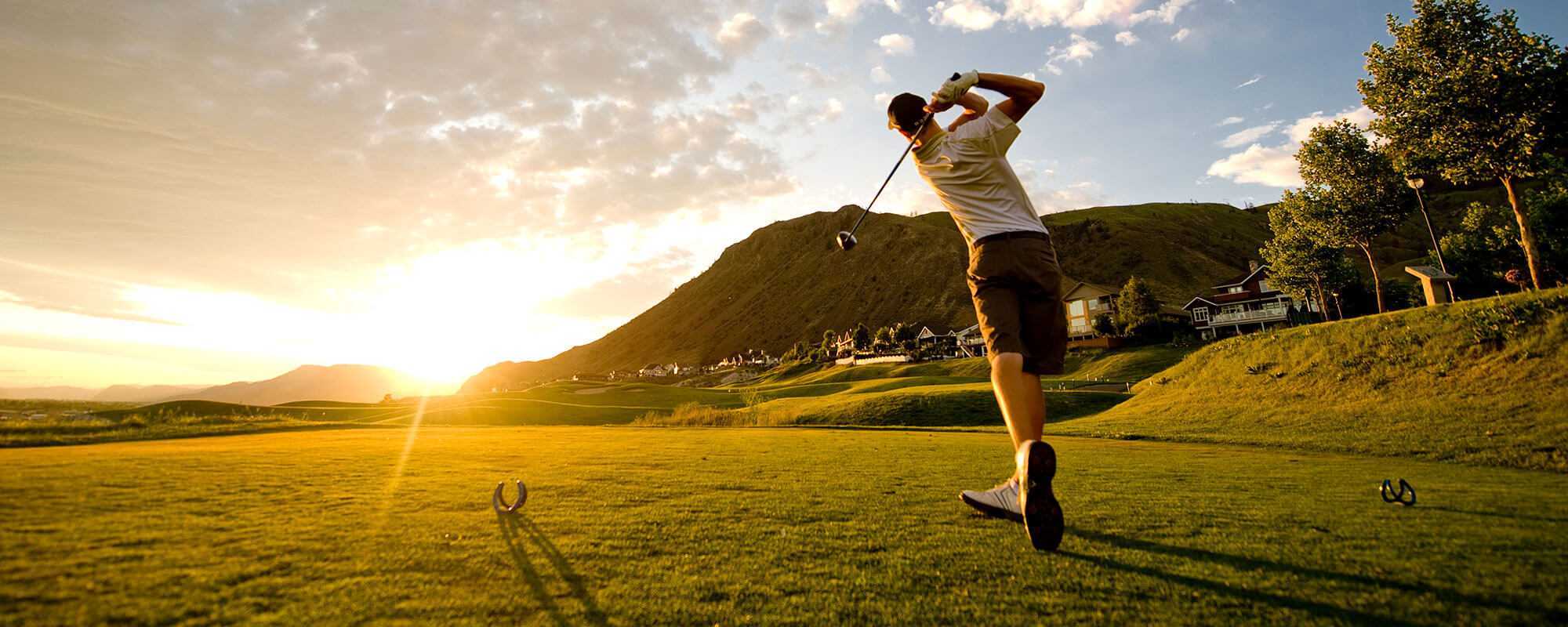 Red flag on sunlit green at Bighorn Golf Kamloops during golden hour with mountain backdrop